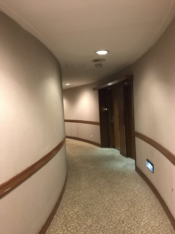 エレベーターホールから部屋に続く廊下はこのようにカーブしており、建物が円筒形であることがよくわかります。