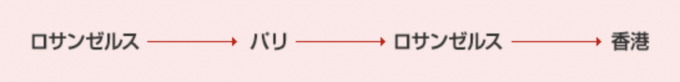 まずはJAL特典で発券できる旅程の例を解説しますが、JAL特典もJMB提携特典もワンワールド特典も発券できる旅程の基本パターンは同じなので、これをJALマイルで交換できる国際線特典航空券の基本パターンとして覚えておいて問題ありません。