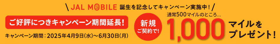 2025年4月9日〜6月30日の期間で新規特典でもらえるマイルが500マイル増量(通常500マイルのところ1000マイル)されるキャンペーンが実施されているので、新規契約するなら6月30日までがおすすめです。